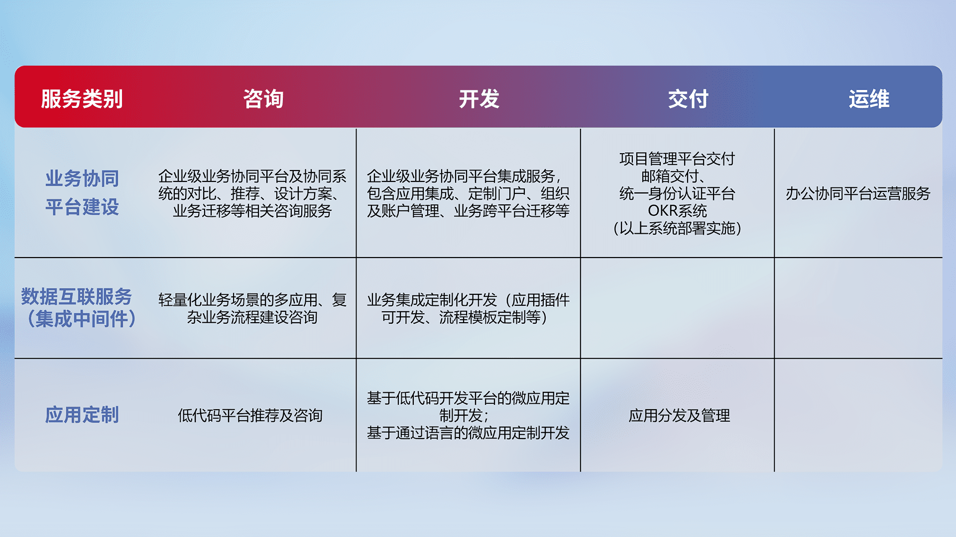 针对钉钉、、企微、、、IDaas等平台级产品提供产品的规划、、方案、、、交付、、、定制化开发等服务,,,实现如统一协同办公、、智能客户服务、、混合会议管理、、、智能数据查询、、、等业务场景,,,实现数字化转型。。